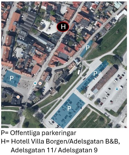 Varmt välkommen till oss på Hotell Villa Borgen & Adelsgatan B&B. Om du anländer med bil går det bra att först köra till oss för att lämna väskor. Det finns gott om offentliga parkeringar i närheten av hotellet, de finns utmärkta på kartan här till vänster. Vi rekommenderar att du använder appen Parkster som finns för på Iphone och Android.